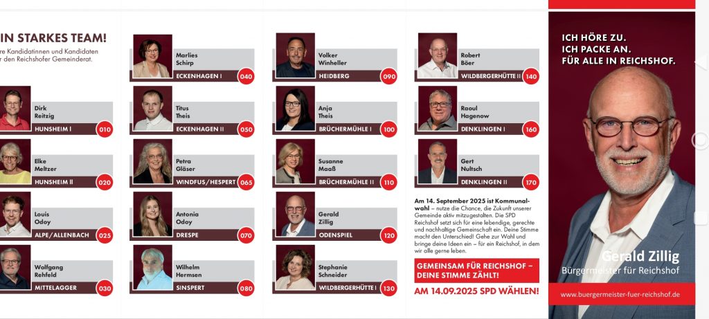 Am Samstag, den 16. August 2025, lädt die SPD Reichshof ab 9:30 Uhr zum Info- und Kennenlern- Wahlstand vor der Metzgerei Hochhardt in Wildbergerhütte ein.